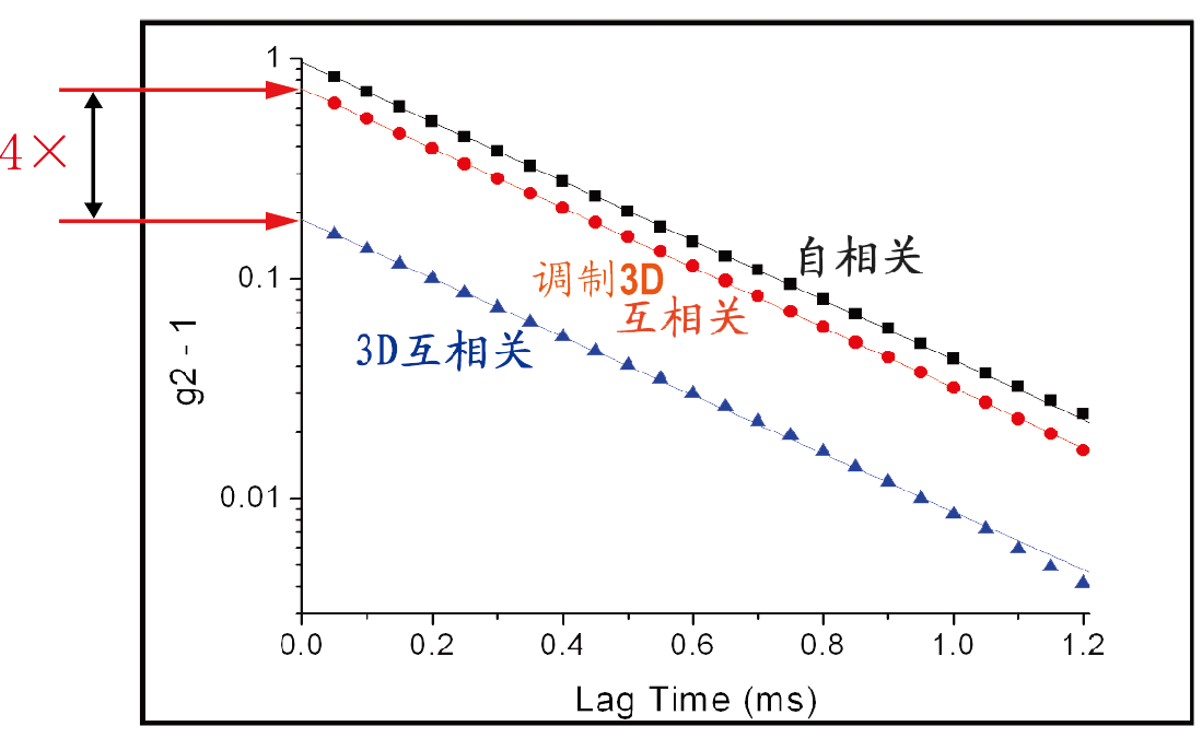 三維互相關技術采用兩組同時進行的光散射實驗對同一散射矢量同一樣本體積進行測試,由于平行試驗的兩個檢測器之間的信號會存在串擾,所以三維光散射技術相對于傳統的自相關或準互相關光散射技術,再其展現“較高濃度測試上限”優勢的同時,背后也存在著“先天不足”,其信噪比差,體現在光強相關函數的截距理論值卻只有0.2,所以在面臨一些弱散射體系時就會陷入困境。